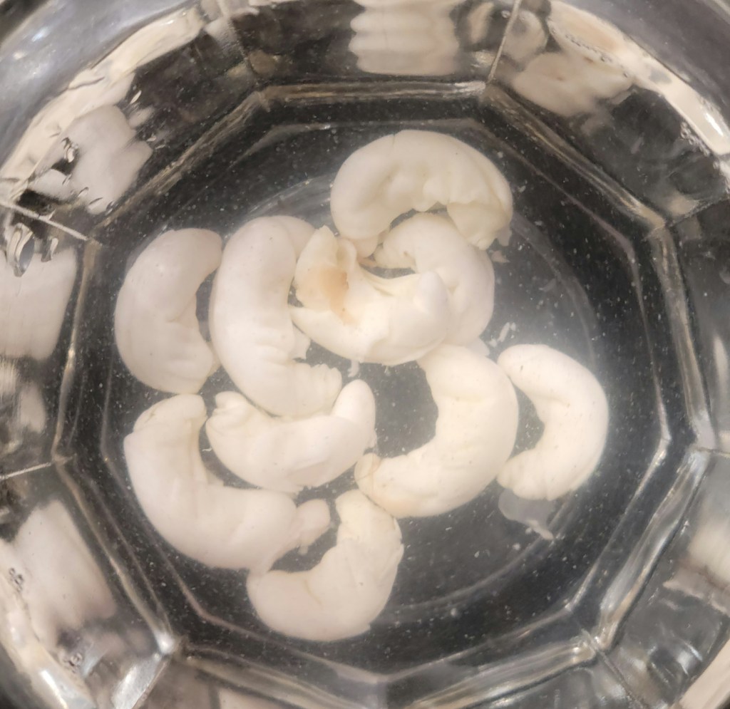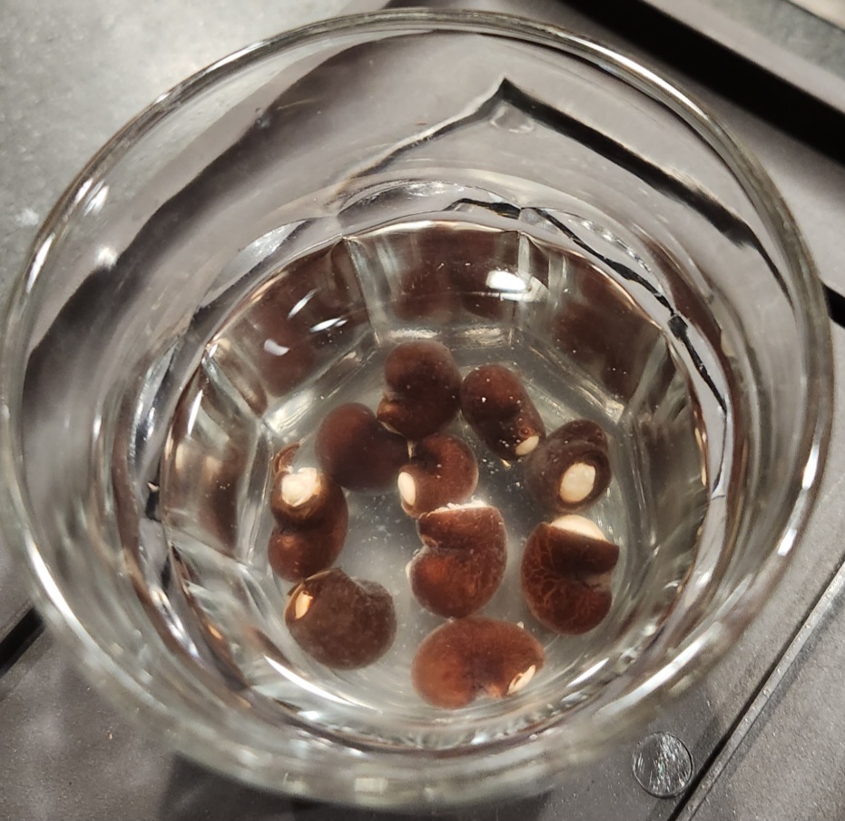 Below are the baby tree embryos which have been removed from the seed capsule. They will soak for one more day in this bath before transfer. One end of the embryo is a pair of cotyledons – the leaf like structures that open to feed the new tree as it sprouts. You see them on beans when they first come up, so I know you’re familiar with cotyledons even if you don’t know what they are called. On the other end of the embryo is the root stub. The embryos began enlarging almost as soon as they were released from the seed hull. As you can see, they look weirdly like insect larvae, or grubs.