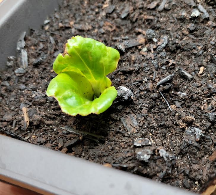 After soaking for a day, the embryos are placed between layers of moistened paper towels in a warm place in the house for another 2-3 days or so, during which time they begin to sprout. Once the little root is seen and the sprouting embryonic leaves are reaching up, the baby is planted an inch deep on its side in moist potting soil and kept in a warm place. Within fourteen days, the two leaf-like cotyledons will emerge from the soil, followed soon by the new growing stem of the tree. In the photo below you see the two big leaf-like cotyledons, and between them, way down deep, just the hint of two tiny new leaves coming up on a stem.