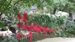Now, here’s another cool idea I came up with in the summer of 2010. It all started with my son’s wedding in the back garden, and I was trying to find a way to separate the driveway from the patio where the ceremony would occur. I had already planted an Autumn Clematis on the main fence, then added some trellises for them to climb over to, but they didn’t provide quite enough screening effect to suit me by the time the wedding was about to happen. So, I asked the florist to find a red synthetic gossamer fabric that would be light and inexpensive and resist the effects of rain and sun; she just happened to have such a thing on hand. I wove it through the trellis with her help and trailed it on through the Impatiens in the garden, and now look at this! It is really beautiful, and a marvelous idea for all summer. I will try it again next year with a different color of fabric. It is a neat and easy idea to apply anyplace you need a splash of color and/or some privacy!