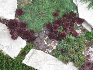 An interesting fact is that the various ground covers and hens-and-chicks maintain their color throughout the winter under the leaves and snow. In fact, some of the hens-and-chicks really take on their most intense color in the cold, late in the fall. So, this little garden provides a lot of interest all the time. In August the roses are six feet tall in the back with gorgeous blooms!