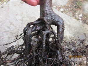 So, I dug it up and found, to my delight, that this little tree has the most fantastically interesting clump of “nebari“, or large twisted roots at the base of the trunk; it’s these roots that make the trunk particularly interesting artistically, and also enhances the value of the Bonsai.