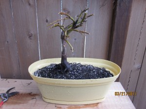 I made the decision to go with an oblong shaped pot six inches deep – deeper than is usually used for Bonsai, my reasoning being that the recommended lowest temperature for the Bonsai is 14 degrees F, a temperature significantly higher than the lows one might see here in Iowa of -20 on occasion. Deciduous Bonsai must have a cold winter dormant period, and the only place that will work for any Bonsai I create for outdoor dormancy is the south side of the house where the pots can be kept slightly warmer than the ambient air temperature. A deeper pot will likely prevent root damage from too low temperatures, especially if the pots are heavily mulched for the winter. On the other hand, we often see temps as high as 100 degrees in the summer, a temp so high that even in the shade a poor little Bonsai is likely to need to be watered constantly, so the pot will need to be embedded in mulch for the summer as well to prevent the soil drying. I have to take all these factors into consideration when determining the best plan of action. A plastic pot will be necessary instead of ceramic as ceramic usually cracks here with these weather extremes.