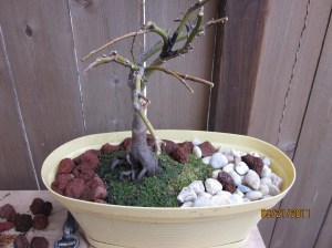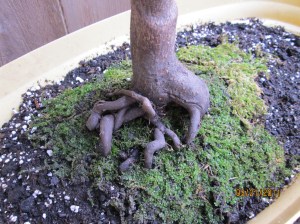 After trimming the roots, the next step was to place the tree into the pot before the roots had a chance to dry out. I put a two-inch layer of large stones in the bottom and filled the pot with a combination of garden topsoil and black loam from my garden, mixed with some vermiculite. This is not the usual formula, but again I had to take into account weather conditions here in Iowa, so wrong or right, that’s what I did. I then carefully placed the tree and trimmed the branches, carefully tamping the soil down around the roots and leaving the nebari beautifully exposed. Then I collected red lava stones, white marble stones, and patches of moss growing around my house here and there to finish off the top of the soil.