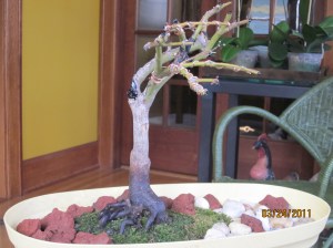 The final step was to artistically trim a few more branches and carefully wire them with copper wire to begin the process of forcing them to grow in the correct direction. Finally, I brought the whole thing inside where it will be safe from varmints as it re-establishes its roots and begins leafing out for spring. I hope it works as well as I imagine!