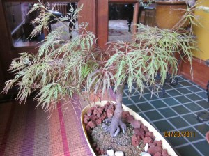 The Bonsai Handbook confirmed my suspicions as I read through it at breakneck pace and discovered that, with a little modification to take into account the severity of Iowa winters, I could more than likely manage to create my own Bonsai. In fact, I knew just the little tree to consider – a small five-year-old Japanese Fern-Leaf Red Maple that had been struggling year after year under the heavy weight of Iowa’s wet winter snows; it was all gnarled and scrawny for its age, but tough as the dickens, and the trunk was about the right diameter.