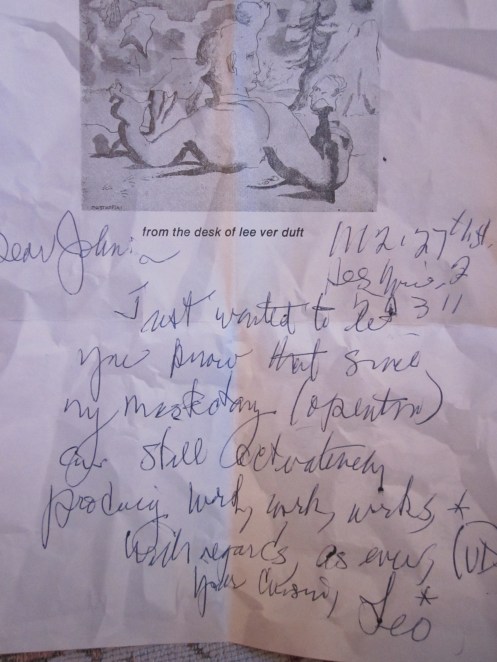 A letter to my dad, John Coster with Lee’s personal stamp at top. It says “Dear John, Just wanted to let you know that since my mastectomy (operation) am still activatingly(sp) producing work, work, works* With regards, as ever, your cousin, Leo*” I can’t read the postmark on the envelope for this letter, but it is after 1981; Lee died of a brain tumor in 1985; the brain tumor may have been metastatic breast cancer, an unusual but not unheard of disease in men.