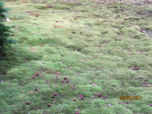 So, one day I was in St. Louis and decided to visit the Missouri Botanical Gardens. What a treat! The place is stunning, and any reader who has the opportunity and any interest at all in gardening should go! Water gardens, conservatories, annual beds, exotics, garden sculptures, massive Asian style gardens, herbariums, and more – just a stunning place. There I stumbled upon a moss garden hidden on a peninsula under a copse of little trees overlooking the big pond in the massive Japanese gardens. It was quiet. There was a stone path leading into a little stone hut where one could sit and admire the carpet-like appearance of the moss, with little red crab apples scattered across it, while ducks and Canada Geese landed on the pond. Each person who came in went silent, as if they were in a sanctuary of sorts. It was really not just visually beautiful, but an overall beautifully immersive experience.